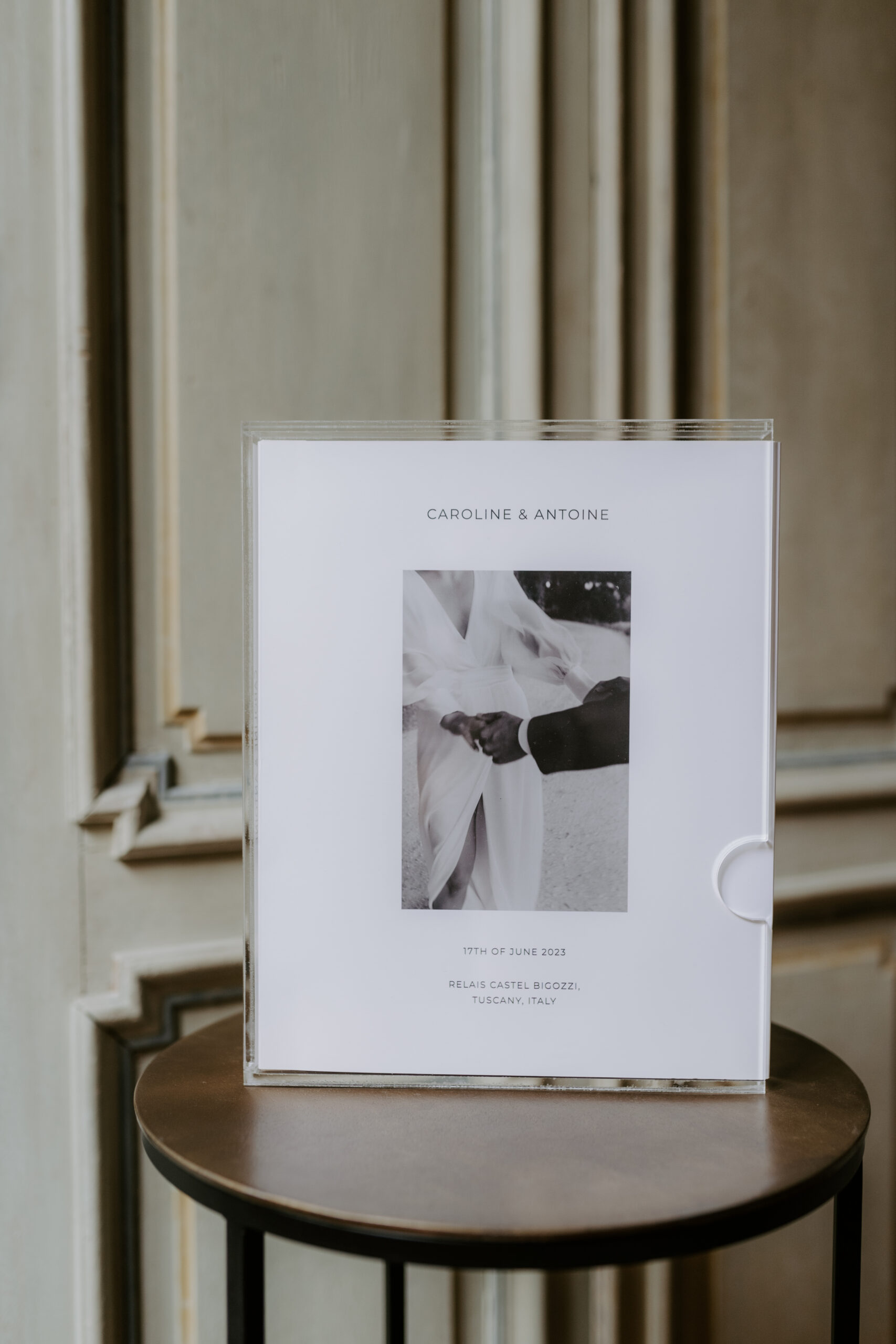 To protect your album in the best possible way, we recommend either a Dust Cover or the Acrylic Box. The Dust Cover consists of your names, a picture and other details of your wedding. The Acrylic Box impresses with its simple elegance and can also present your album as a coffee table book. For reference please have a look at the video on top of this page.